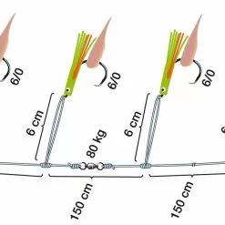 De cirkelhaken in de roodbaars leaders worden voorzien van kleine stukjes visfilet. Vis deze leader eerst op de bodem, na enkele minuten zonder resultaat kan de montage enkele meters worden ingedraaid om de vis in een andere waterlaag te vinden. Op zoek naar voedsel kan de roodbaars stijgen tot halfwater. De fluorescerende kleuren op de cirkelhaken maken deze hoogst aantrekkelijk voor de roodbaars.