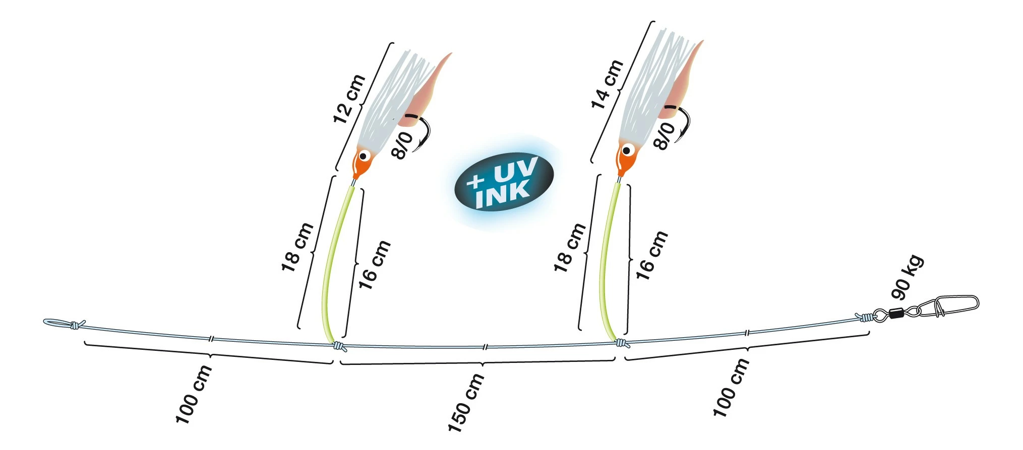 Deze leader is voorzien van een enkele haak met fluo-octopus en kan op of boven de bodem gevist worden met loodgewichten tussen de 300 en 500 gram afhankelijk van de stroming en weersomstandigheden.