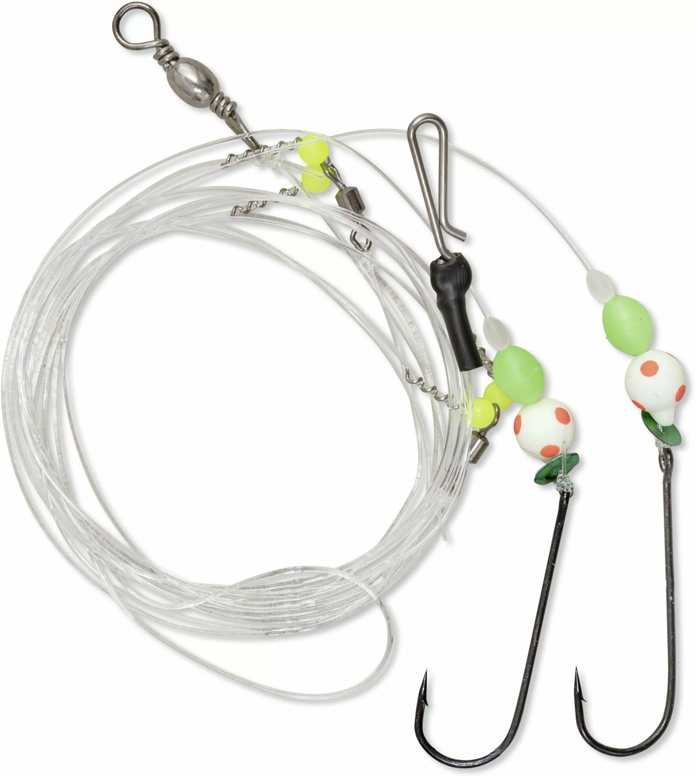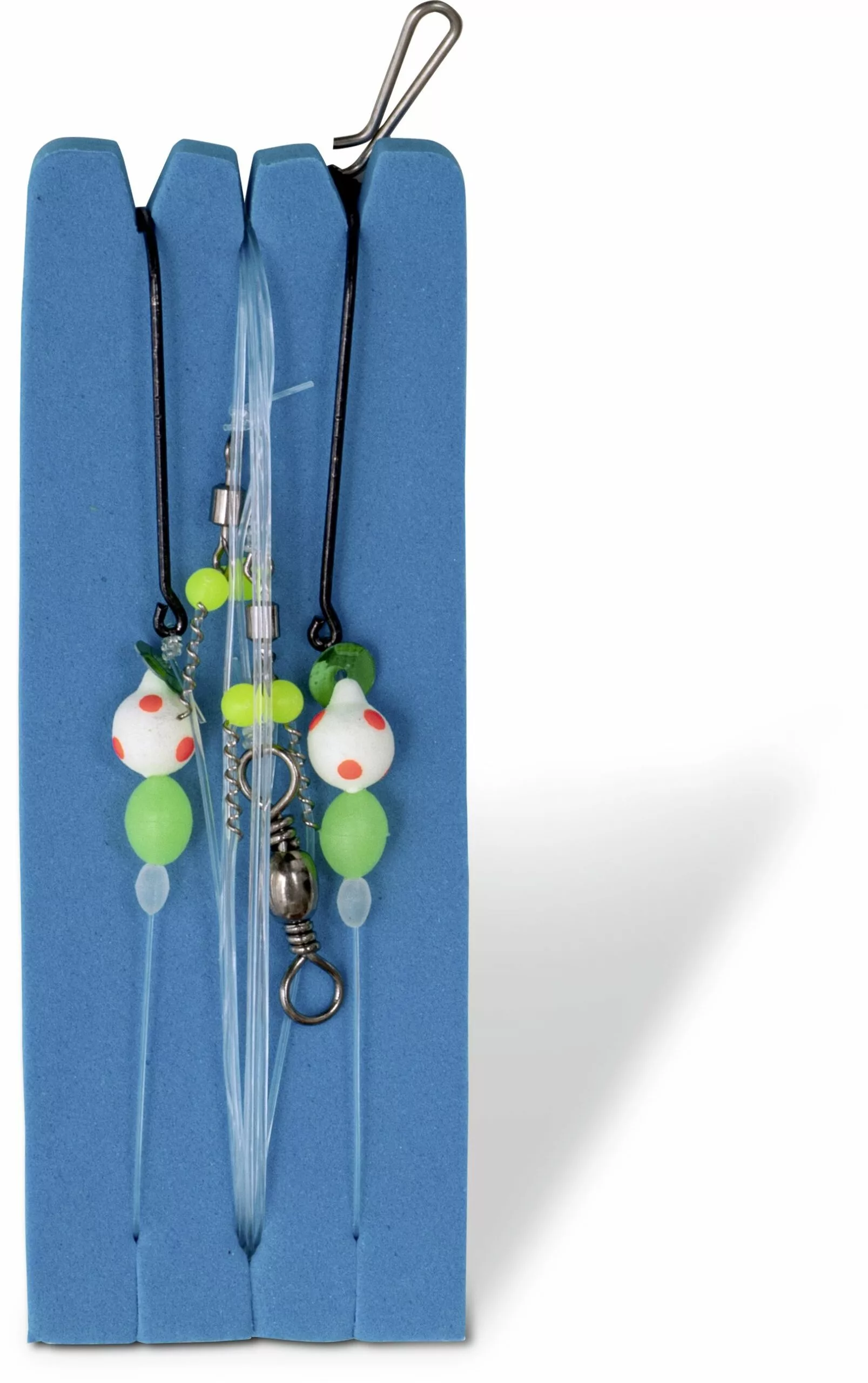 Haakmaat 1/0+1/0, hoofdlijn Ø 0.70 mm, onderlijn Ø 0.50 mm. Lengte montage: 120 cm. Flapper met 2 haken. Voor kantvissers.