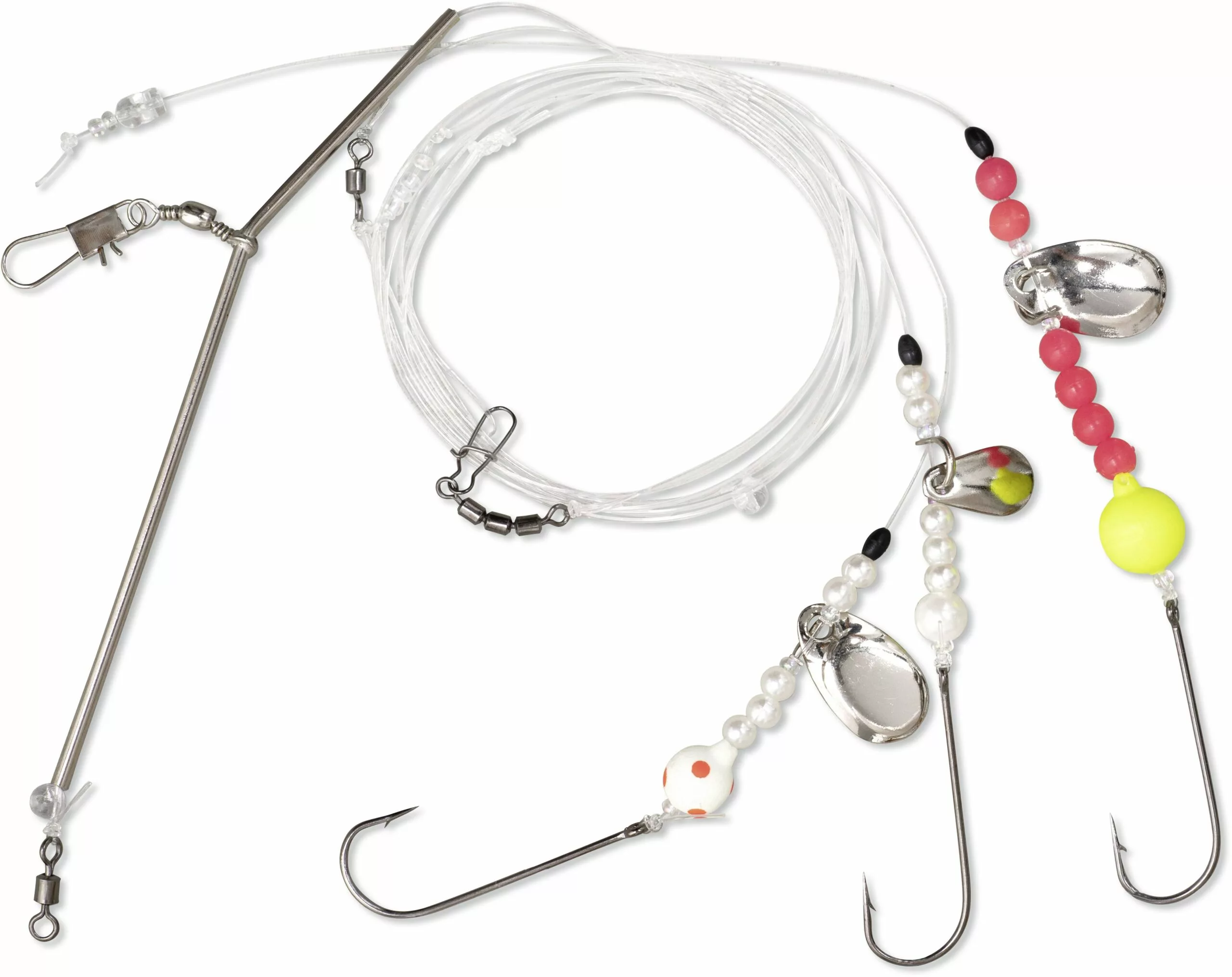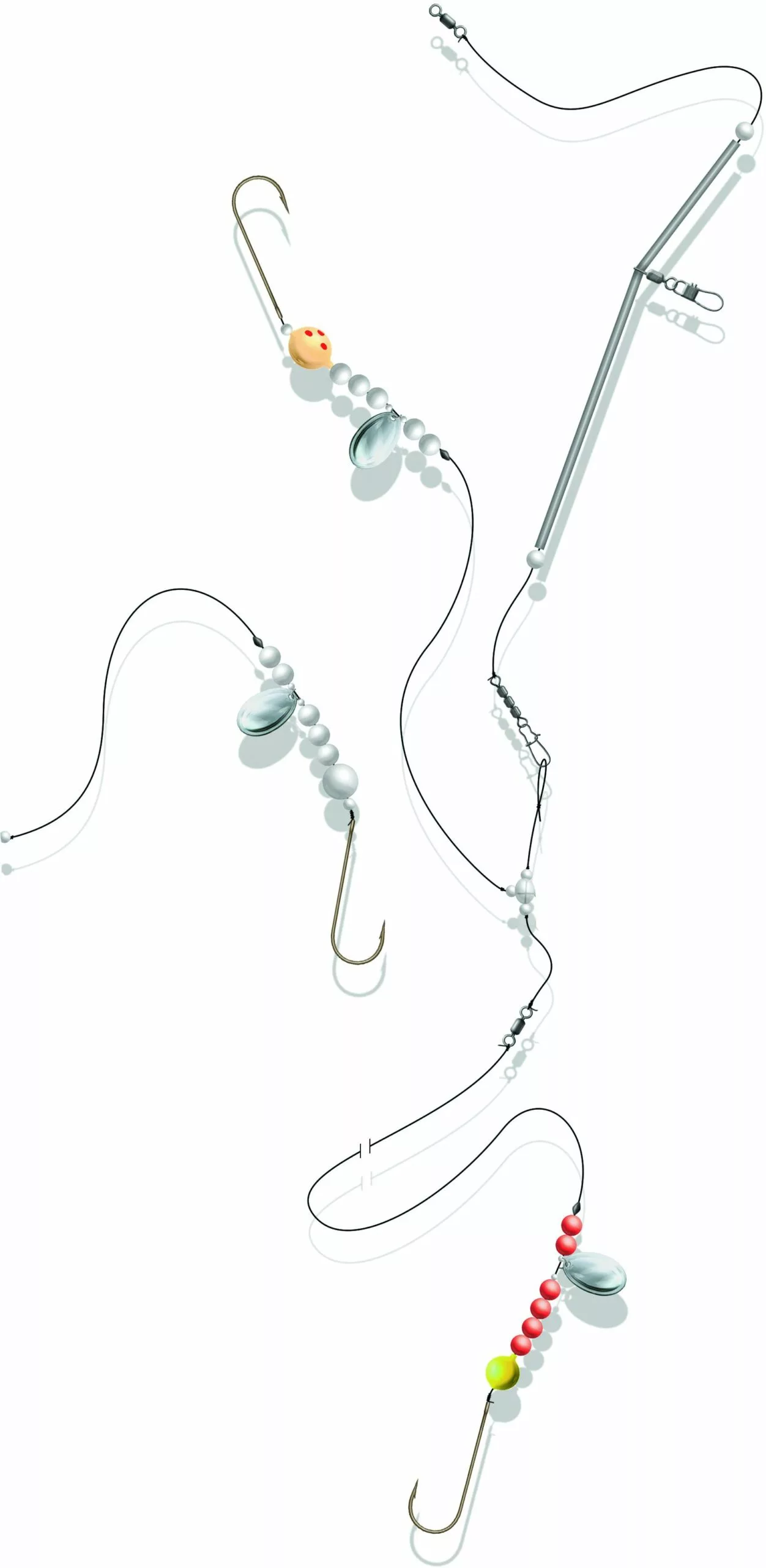 Montage voor het vissen met natuurlijk aas vanuit de boot op platvis. Met drie haken, spinnerbladen en lokkraaltjes en een afhouder. Wordt geleverd met een extra onderlijn zodat u via een speciale kraal snel kunt omwisselen als dat nodig is.
