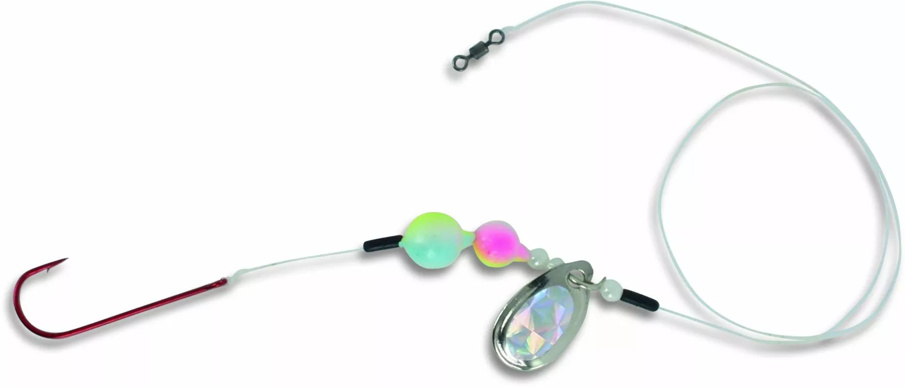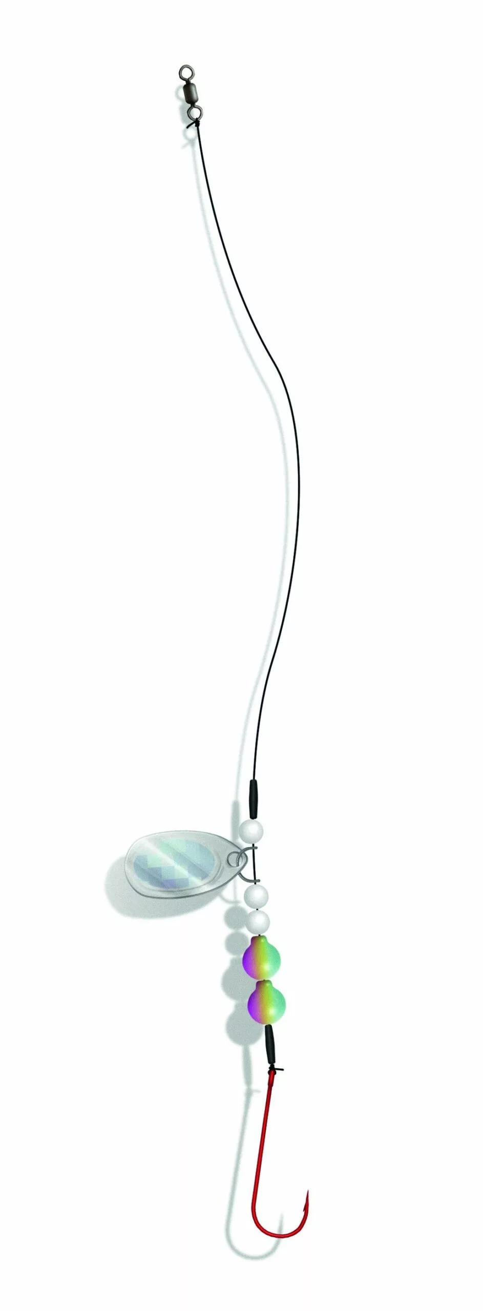 Verfijnde platvisonderlijn met een combinatie van een klein spinnerblad en twee lokkralen.