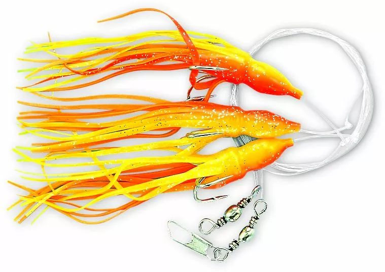 Met 3 vernikkelde dreggen, voorzien van een rood-gele octopus.