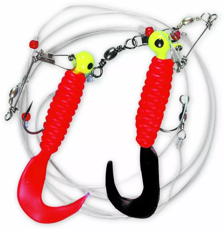 Haakmaat 3/0, 2 haken, rood en zwart/rood. Lijndiameter 0,70 mm.