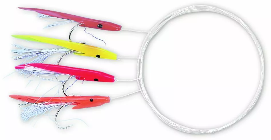 Met 4 kleine, gekleurde plasticvisjes op een haak 3/0 gebonden met glitterdraad.