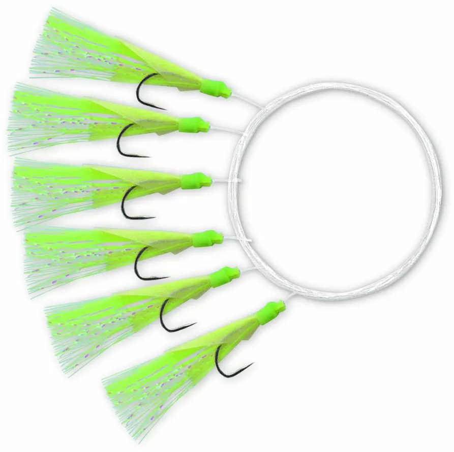 Haringmontage met 6 haken waarop glow-in-the-dark kunstaasjes zitten. Ideaal in donkere weersomstandigheden. Ø0.40 mm, haakmaat 6.