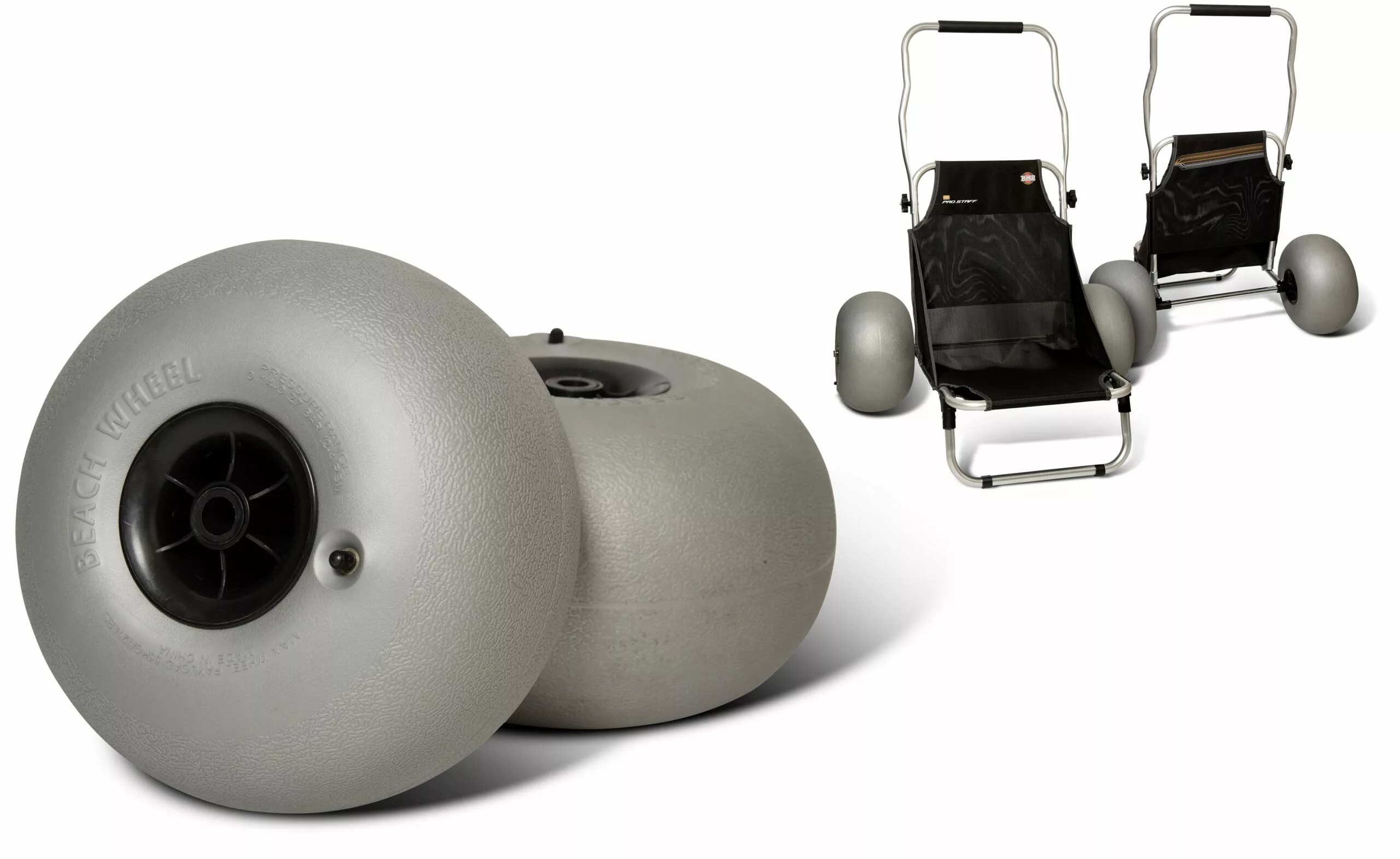 Ultrabrede ballonwielen voor het strand of ruig terrein. De diameter van de as is 2,3 cm, wat betekent dat ze zeker niet op elke trolley passen. Verstelstukken (niet inbegrepen) kunnen dus noodzakelijk zijn.